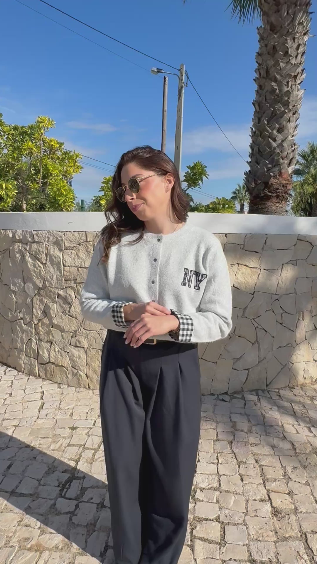 Cardigan de malha cinza claro com botões, detalhe NY no peito e punhos dobrados em xadrez azul escuro e branco.